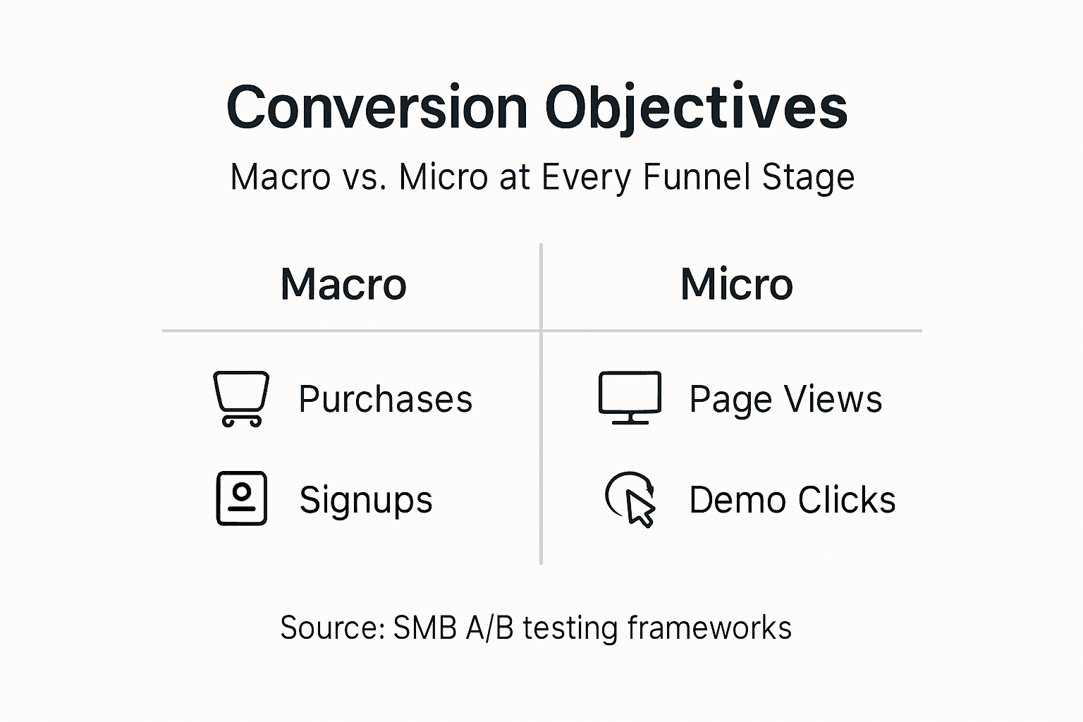 Conversion objectives fall into two fundamental categories that shape how you measure A/B test success. Macro conversions represent the final, revenue-impacting actions users take on your site. These include completed purchases, signed contracts, or subscription upgrades. They sit at the bottom of your funnel and directly affect your bottom line.
